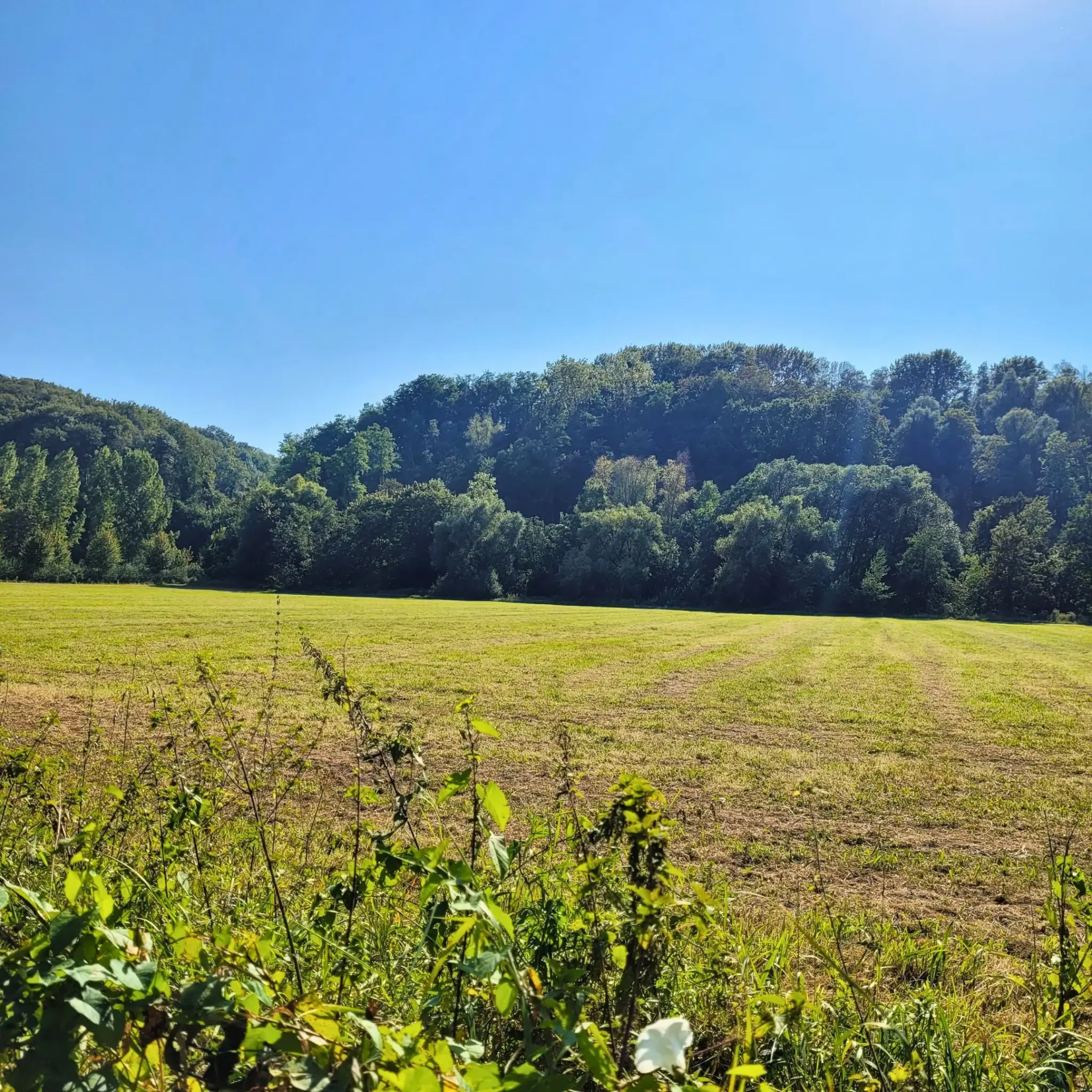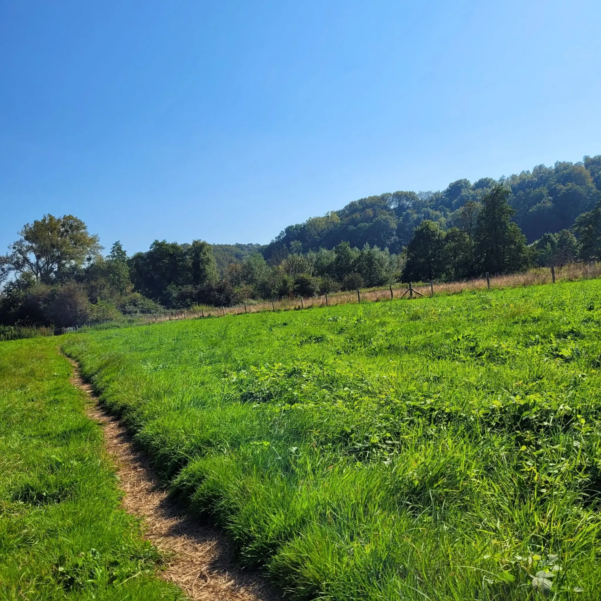 Na het passeren van de ezels opende het landschap zich plotseling en kwam ik op een open veld terecht. Het uitzicht was adembenemend: overal waar ik keek, zag ik alleen maar groen. Aan de rechterkant, in de verte, tekende zich een prachtig bosgebied af, wat nog meer diepte en variatie aan de omgeving gaf.